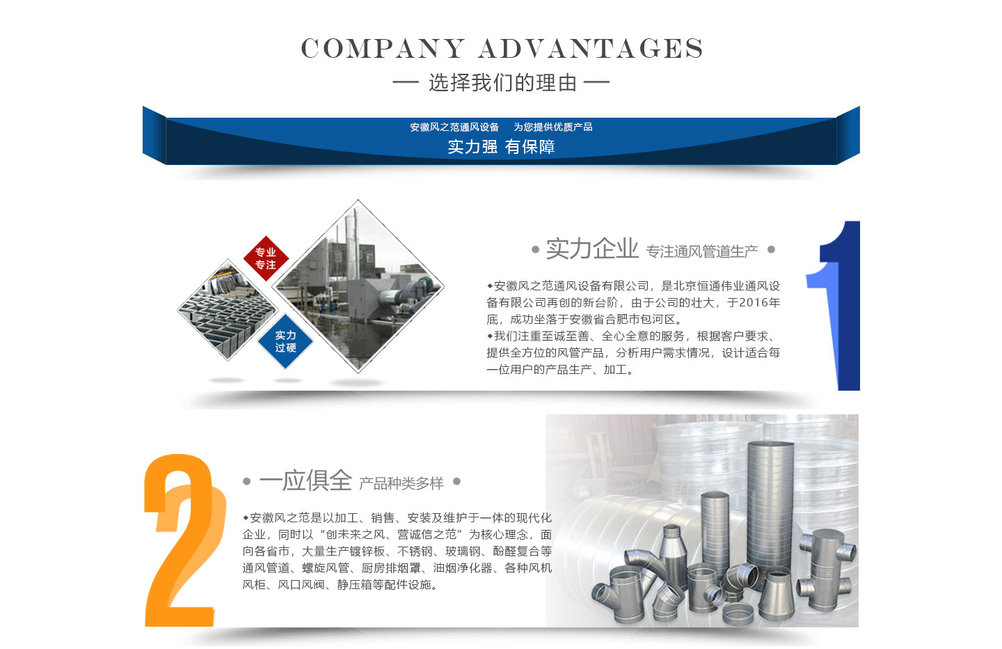 安徽風(fēng)之范通風(fēng)設(shè)備有限公司,是北京恒通偉業(yè)通風(fēng)設(shè)備有限公司再創(chuàng)的新臺(tái)階,多年來(lái),公司員工憑著“誠(chéng)信敬業(yè)、團(tuán)結(jié)拼搏、勇于開(kāi)拓、務(wù)實(shí)進(jìn)取”的企業(yè)精神,先后承接了多項(xiàng)重點(diǎn)工程項(xiàng)目,使公司健康穩(wěn)步發(fā)展?,F(xiàn)由于公司的壯大,業(yè)務(wù)的拓展,又于2016年底,成功坐落于安徽省合肥市包河區(qū)。本公司生產(chǎn)設(shè)備精良,技術(shù)力量雄厚,質(zhì)保體系完善!讓用戶體驗(yàn)到,貼心的服務(wù),無(wú)憂的售后!風(fēng)之范是以加工、銷售、安裝及維護(hù)于一體的現(xiàn)代化企業(yè),同時(shí)以“創(chuàng)未來(lái)之風(fēng)、營(yíng)誠(chéng)信之范”為核心理念,面向全國(guó)各省市,大量生產(chǎn)鍍鋅板、不銹鋼、玻璃鋼、酚醛復(fù)合等通風(fēng)管道、螺旋風(fēng)管、廚房排煙罩、油煙凈化器、各種風(fēng)機(jī)風(fēng)柜、風(fēng)口風(fēng)閥、靜壓箱等配件設(shè)施。廣泛承接商場(chǎng)、工廠、酒店、寫(xiě)字樓、地下室等,消防排煙工程、除塵凈化工程、室內(nèi)通風(fēng)工程、暖通空調(diào)工程、廚房排煙凈化工程。我們力求上進(jìn),追求,歡迎各界人士技術(shù)指導(dǎo),經(jīng)濟(jì)合作,共創(chuàng)美好明天!